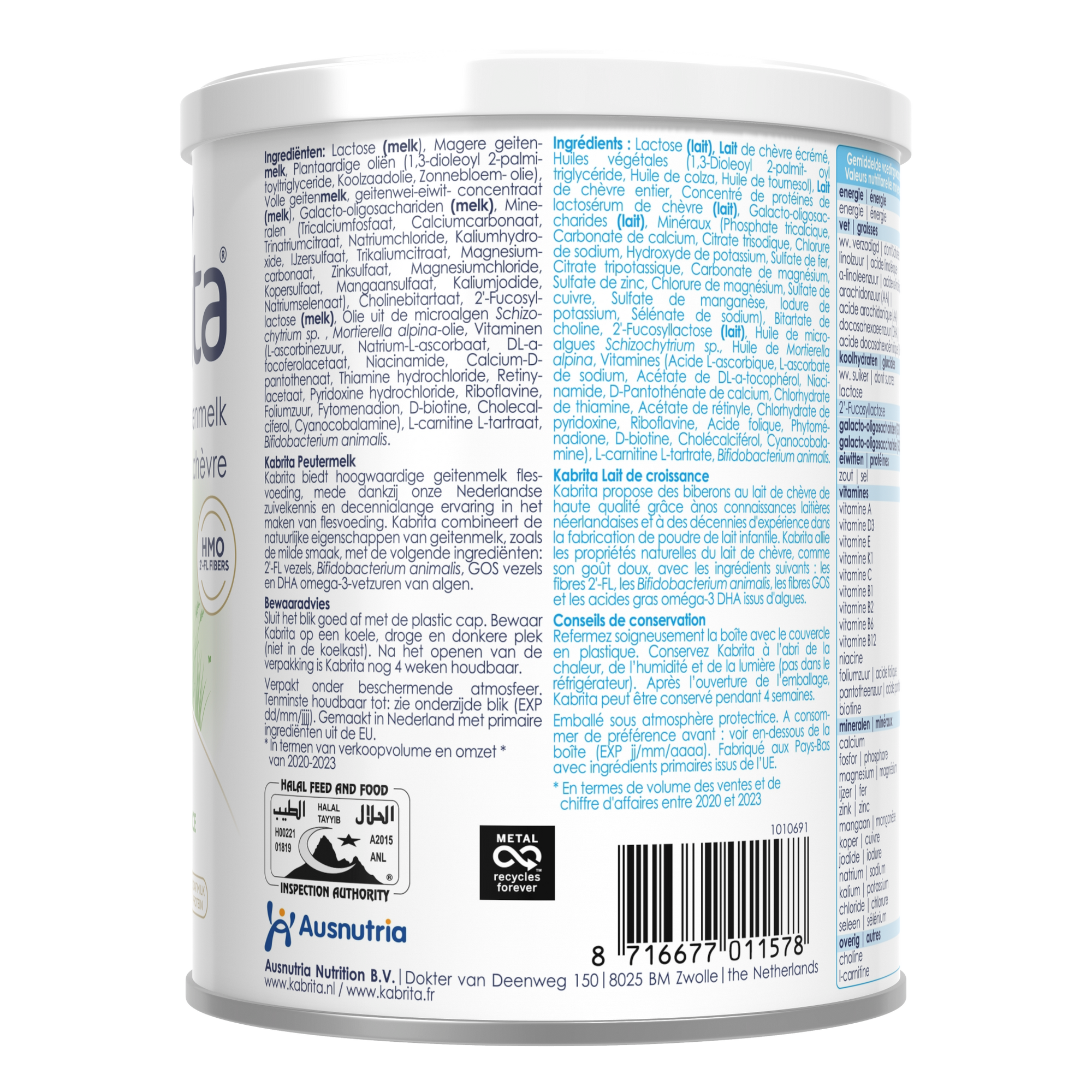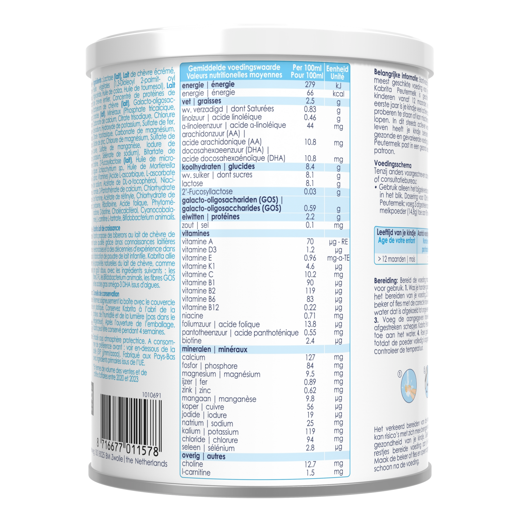 Lactose (melk), Magere geitenmelk, Plantaardige oliën (1,3-Dioleoyl-2-palmitoyltriglyceride, Koolzaadolie, Zonnebloemolie), Volle geitenmelk, Geitenwei-eiwitconcentraat (melk), Galacto-oligosacchariden (melk), Mineralen (Tricalciumfosfaat, Calciumcarbonaat, Trinatriumcitraat, Natriumchloride, Kaliumhydroxide, IJzersulfaat, Kaliumcitraat, Magnesiumchloride, Magnesiumcarbonaat, Zinksulfaat, Kopersulfaat, Mangaansulfaat, Kaliumjodide, Natriumselenaat), Fructo-oligosachariden, 2'-Fucosyllactose (melk), Cholinebitartraat, Olie van de microalg Schizochytrium sp., Mortierella alpina olie, Vitaminen (L-ascorbinezuur, Natrium L-ascorbaat, DL-a-tocoferylacetaat, Niacinamide, Calcium D-pantothenaat, Thiaminehydrochloride, Retinylacetaat, Pyridoxinehydrochloride, Riboflavine, Foliumzuur, Fytomenadion, D-biotine, Cholecalciferol, Cyanocobalamine), L-carnitine L-tartraat, Bifidobacterium animalis.