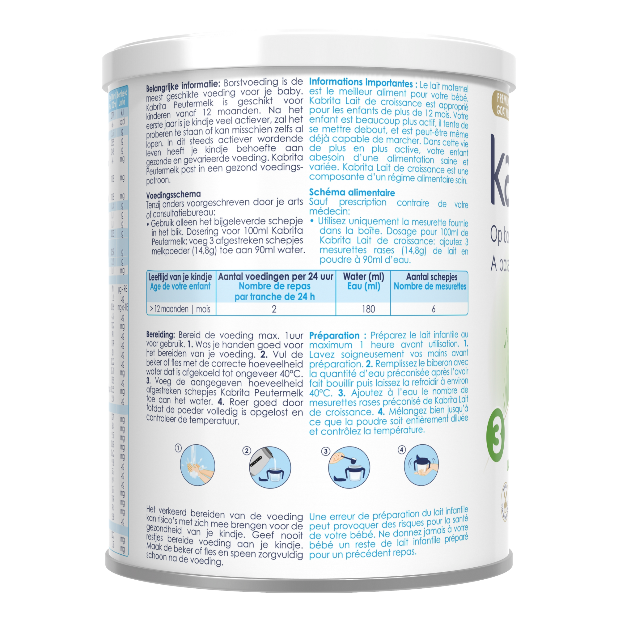 Het is land specifiek wat wordt aanbevolen maar in het algemeen is de Kabrita formulering specifiek ontwikkeld voor jonge kinderen van 12 - 36 maanden.