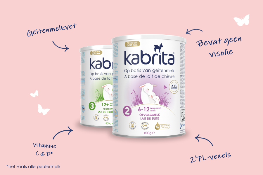 Kabrita raadt borstvoeding aan. Wanneer je (gedeeltelijk) flesvoeding gebruikt, is Kabrita 2 Opvolgmelk bedoeld vanaf 6 maanden en Kabrita 3 Peutermelk vanaf 12 maanden.